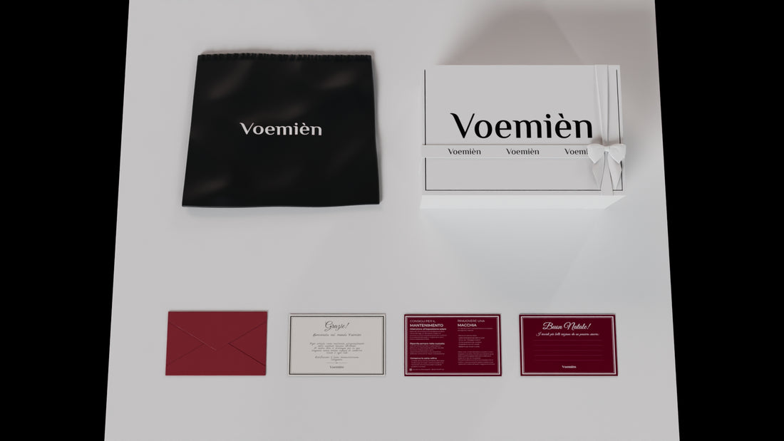 The white box with the black Voemièn logo, adorned with an elegant ribbon, is the symbol of sophisticated and timeless style, perfect for enhancing every detail of your gift. -